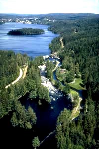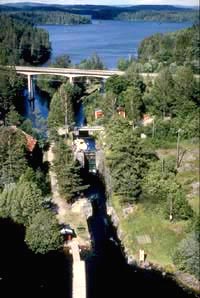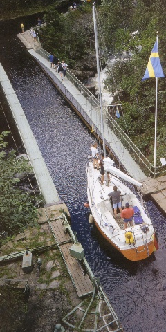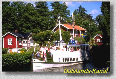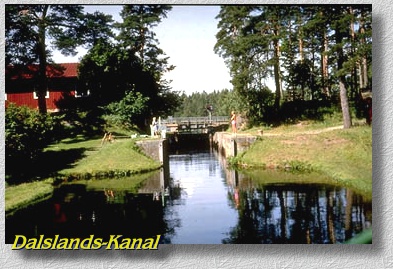 Mustadfors, Dals-Länged, Langbron und Billingfors markieren weitere acht Schleusen. Dann folgen drei namenlose, die lediglich die Bezeichnung 18. bis 20. Schleuse führen, ehe man Bengtsfors erreicht. Während die Geschwindigkeit auf den Seen keiner Reglementierung unterliegt,wird sie in den eigentlichen Kanalabschnitten, zumeist durch Schilder, auf "10 Km / Std." begrenzt. Bereits hinter Langbron beginnt die Landschaft mit ihren hellen Birken und dunklen Tannen, mächtig und uralt zumeist, jenen urwüchsigen Wildnischarakter anzunehmen, der einen zusammen mit der Leere und Einsamkeit wie eine Art von Schock trifft. Das idyllische Bengtsfors mit seinen berühmten Mittsommerfestlichkeiten, zentraler Ort des weit gestreckten Hinterlandes im nördlichen Dalslands, bietet noch einmal reichliche Einkaufsmöglichkeit und einen zum Festmachen einladenden Gasthafen. Dann ein weiterer Höhepunkt der Reise, die als dreistufige Treppe einen Berg hochsteigende Schleuse von Lenartsfors, die Ufer von dem Grün dichter alter Bäume flankiert und dahinter ein enger, in den Fels geschlagener, Kanaldurchstich, die imposanteste Stelle der ganzen Strecke. |